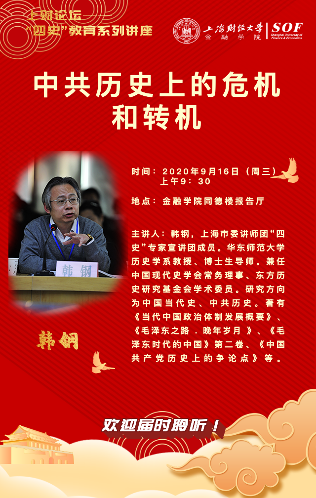 上财论坛——“四史”教育系列讲座进行时。华东师范大学历史系教授、博士生导师,华东师范大学中国当代史研究中心研究员韩钢教授主讲。上海财经大学党委宣传部、上海财经大学金融学院党委联合主办。欢迎届时聆听!