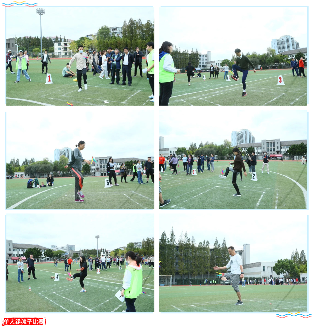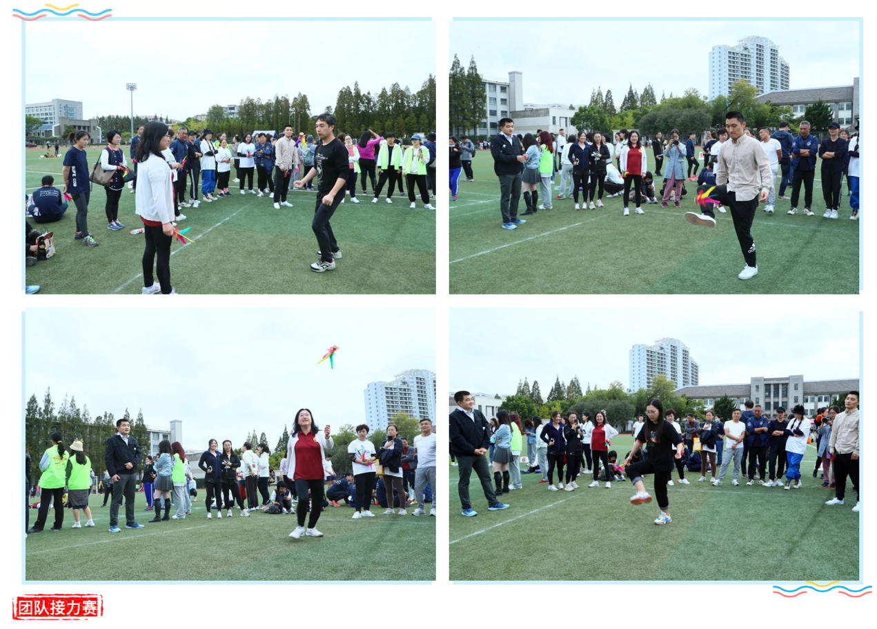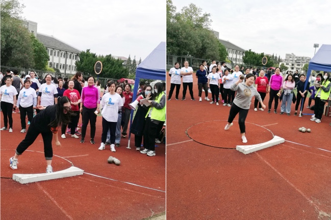在教工踢毽子比赛团体项目里,由叶伟春老师领队、由王学宽、王晓含、章秩新、张月、刘方舟、冯玲、陈选娟、漆芙凤等老师组队出征。比赛中老师们克服风大等不利天气因素,沉稳应战,默契合作。最终漆芙凤与刘方舟老师获得女子双人对踢第二名,章轶新与王晓含老师获得男子双人对踢第四名。