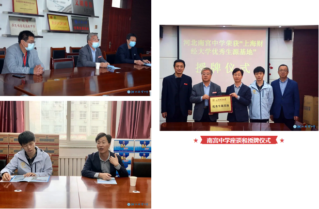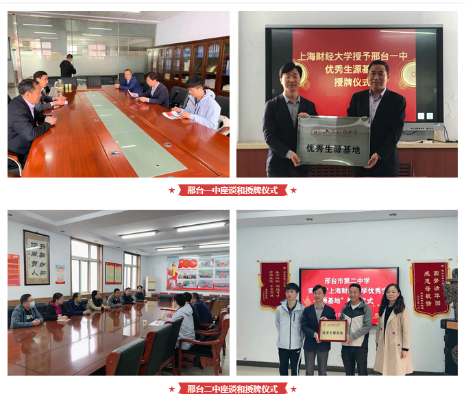 4月24日至28日,上海财经大学招生办公室宋兵超老师、金融学院吴明星老师一行来到河北省邢台市、邯郸市、唐山市和秦皇岛市等地开展本科招生宣传活动,代表学校授予当地部分中学“上海财经大学优秀生源基地”牌匾并举行座谈会,与中学建立起友好合作关系。河北省邢台市第一中学、邢台市第二中学、河北省南宫中学、河北魏县第一中学、唐山市第一中学、秦皇岛市第一中学、秦皇岛市北戴河区树人中学、河北昌黎汇文第一中学、河北省卢龙县中学等校领导、部门分管领导和相关负责老师热情接待了上财一行,并组织了多场招生宣讲座谈会、答疑会,让更多河北学生及家长了解上财、报考上财。