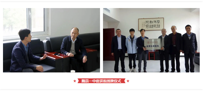 4月25日,我校两位老师来到邯郸市魏县第一中学进行座谈和授牌。魏县一中党委书记李胜春、副校长李世峥、党委副书记马希仲、招生办主任周恒和部分教师代表参加。李胜春书记详细介绍了魏县一中近年来的发展情况,作为县级中学,近年来学校办学水平不断跃升甚至赶超了地市级中学。