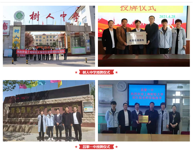 树人中学副校长吴科元,昌黎一中副校长孙立新,卢龙中学副校长郭金良等分别介绍了各自学校的办学特色、发展改革、师资力量与取得的辉煌成就等。其中卢龙中学是中国共产主义的先驱李大钊同志的母校,郭金良副校长还带领我校两位老师瞻仰了李大钊同志雕像,在现场进行了生动的百年党史学习。我校两位老师与各校座谈结束后,分别授予“上海财经大学优秀生源基地”牌匾,并达成合作共识。