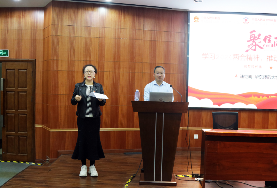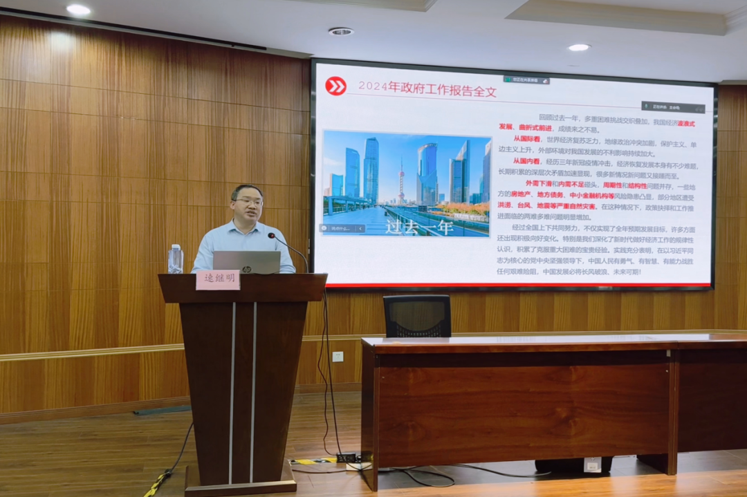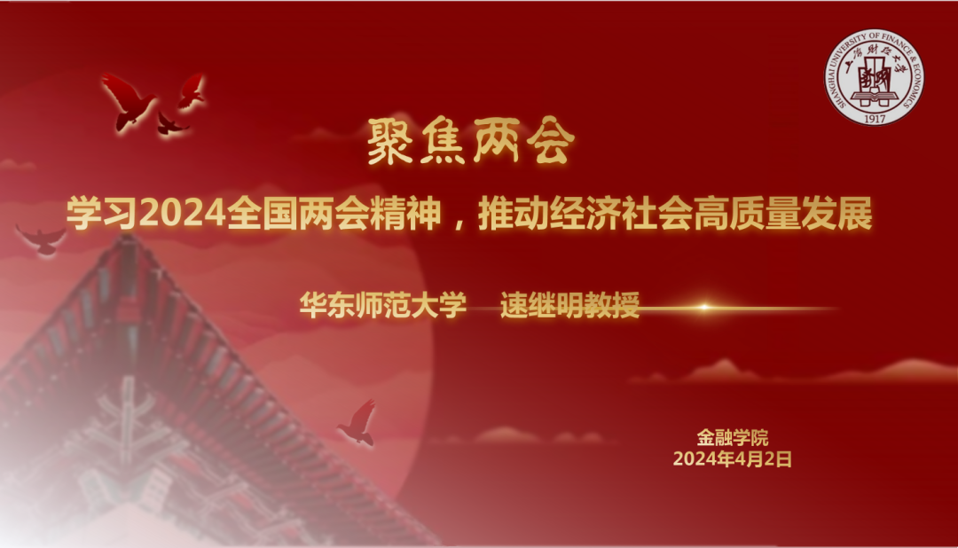 为认真学习贯彻全国两会精神,使金融师生全面了解国家大政方针,不断提高政治觉悟,进一步增强社会责任感,同时促进个人成长提升,4月2日下午金融学院党委在同德楼一楼报告厅举行了“学习2024全国两会精神,推动经济社会高质量发展”专题讲座,讲座邀请了华东师范大学马克思主义学院副院长、教授、博导、国家社科基金重大项目首席专家速继明教授现场讲授,活动由金融学院专职组织员李书华副教授主持,金融学院副院长(主持工作)杨金强教授等300多名师生线上线下参与活动。