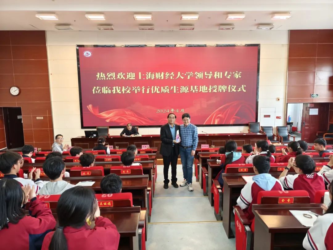 谈儒勇老师代表上海财经大学向金寨一中赠予上财“优秀生源基地”水晶杯,随后讲座活动正式开始。