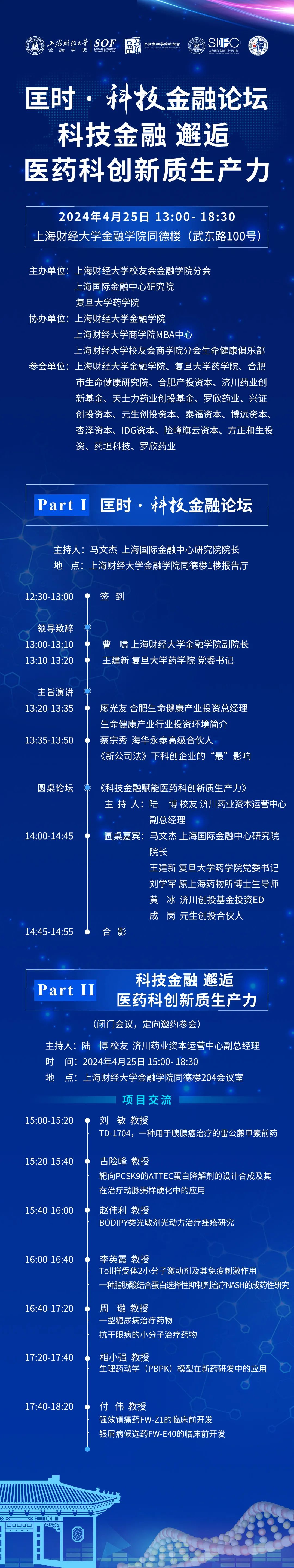 随着科技金融和医疗健康行业的快速发展,行业变革与融合成为大势所趋。不久前,中央经济工作会议提出要以科技创新引领现代化产业体系建设,发展新质生产力。为探索科技金融在医疗保健行业的新应用,促进科技金融和医疗保健行业的跨界合作,搭建医药与金融行业的交流平台,上海财经大学校友会金融学院分会、上海国际金融中心研究院和复旦大学药学院将联合举办《【匡时·科技金融论坛】——科技金融 邂逅医药科创新质生产力》主题论坛活动。活动以科技金融论坛 +项目路演的形式,邀请了来自复旦大学药学院专家、多家知名资本和校友们参会讨论。欢迎广大校友、老师、学生参加交流。