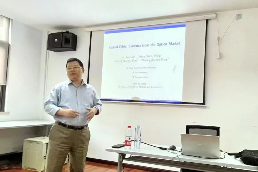 4月25日,来自香港理工大学会计及金融学院金融学系的曹杰教授为上海财经大学金融学院的老师们作题为《阿片类药物危机:来自期权市场的证据》的报告,金融学院刘方舟老师主持。