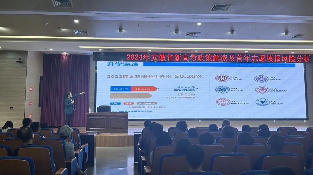 在随后的“2024年安徽省高考政策解读及首年志愿填报风险分析”系列主题报告中,张月老师为合肥八中的考生家长作上财本科招生宣讲,从区位优势、办学特色、学科排名、招录条件、人才培养模式、就业方向等方面对我校进行了介绍。