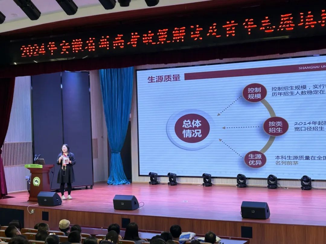由于2024年是安徽新高考改革落地的第一年,如何缓解考生及家长的焦虑情绪,使高校高中更好地加强衔接、协同育人成为各方关注的焦点。在“2024年安徽省高考政策解读及首年志愿填报风险分析”的系列主题报告中,张月老师进行了上财本科招生宣传讲座,结合我校办学特色和学科优势,就未来新高考形势下如何填报志愿提供了建议。