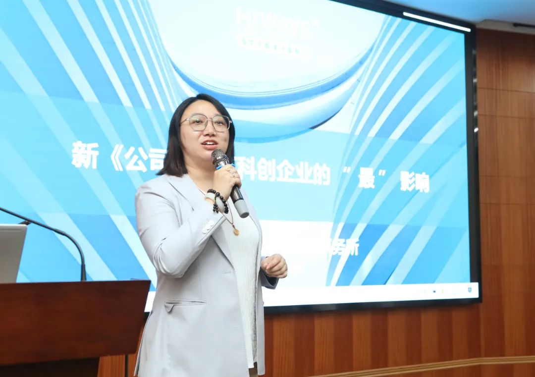 在主旨演讲环节,合肥生命健康产业投资总经理廖光友做题为《生命健康产业行业投资环境简介》的主旨演讲。他从产业规模、产业布局及重点领域介绍了合肥市生物医药产业发展的基本情况。从基金生态、政策生态和创新生态几个角度介绍了合肥市生物医药产业发展的主要举措。第二位演讲的嘉宾是来自上海海华永泰律师事务所的高级合伙人蔡宗秀,她演讲的主题是《新公司法》下科创企业的“最”影响。蔡总从法律的角度谈了《新公司法》对科创企业和投资人资本的影响。