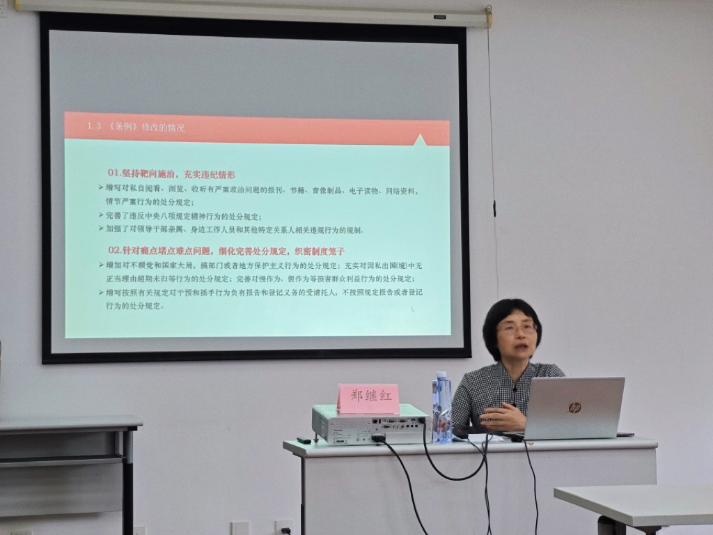 郑继红老师首先简要介绍了《中国共产党纪律处分条例》(以下简称《条例》)的修订意义和修订情况,她表示《条例》修订坚持靶向施治,充实违纪情形;针对痛点堵点难点问题,细化完善处分规定,织密制度笼子;坚持全链条全周期全覆盖,推动正风肃纪向系统整治、全域治理提升转变。