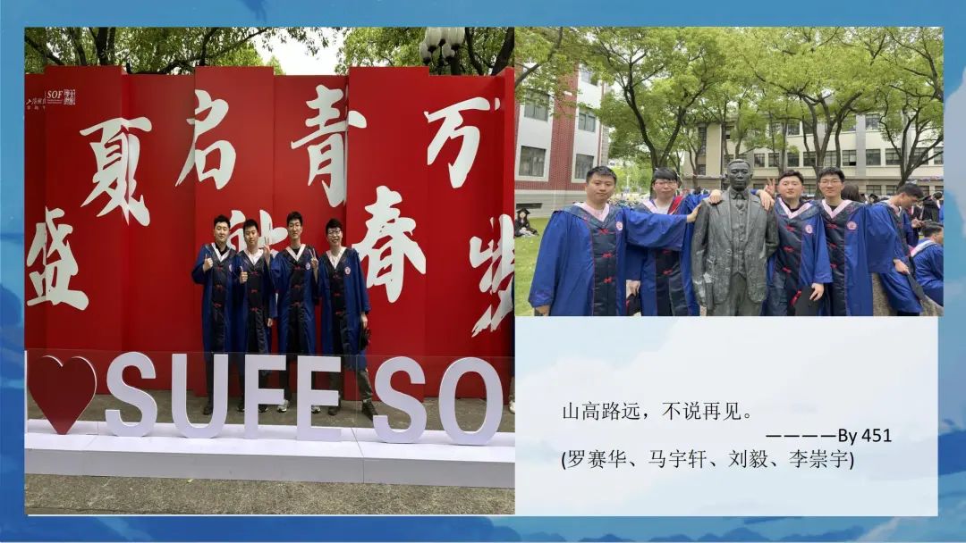 祝大家毕业顺利。希望永记上财“厚德博学 经济匡时”的校训,未来展翅高飞,活出精彩!