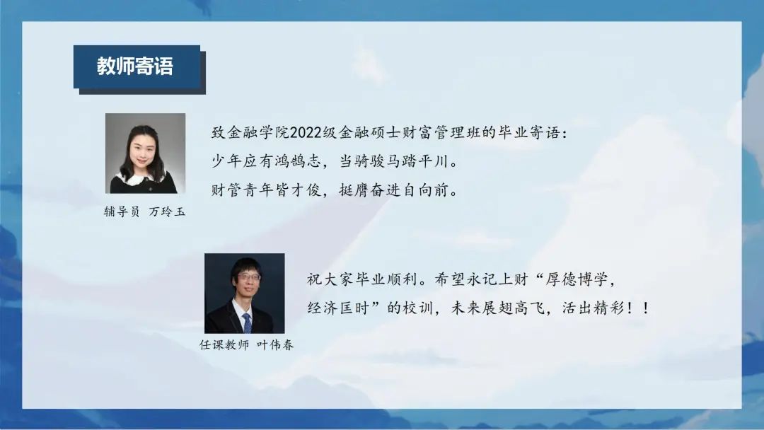 现在一起来看看2022级财富管理班的毕业风采展示吧!ps.搭配BGM观看体验更佳哦~