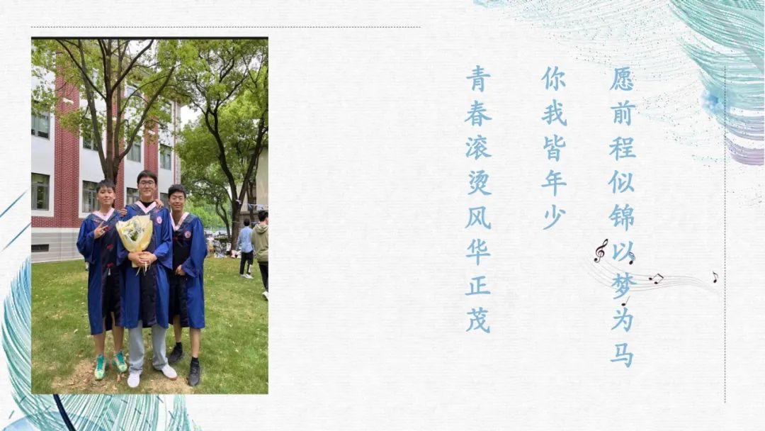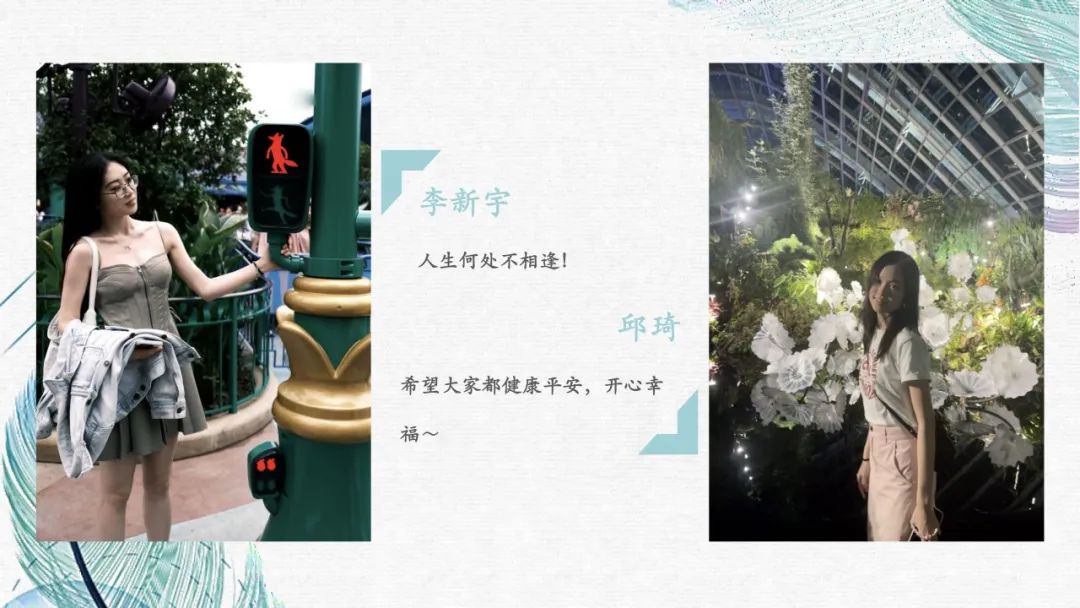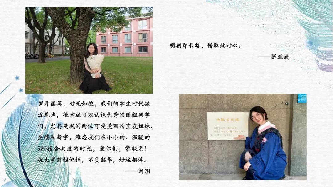 “岁月荏苒,时光如梭,我们的学生时代接近尾声,很幸运可以认识优秀的国组同学们,尤其是我的两位可爱美丽的室友姐妹,企鹅和新宇,难忘我们在小小的、温暖的520宿舍共度的时光,爱你们,常联系!祝大家前程似锦,不负韶华,好运相伴。”