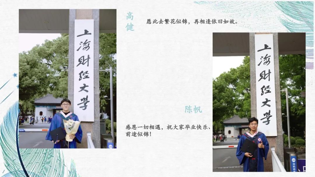 锦瑟年华灵毓秀,不负韶光不负己。祝愿2024届金融学子在强国追梦的新时代里,在未来无限的人生舞台上,继承和发扬“厚德博学,经济匡时”的校训精神,展现上财金融人的情怀和担当,以新时代追梦人的姿态和干劲,坚守理想初心,矢志砥砺奋斗,让青春在拼搏中熠熠发光,奋力书写为中国式现代化挺膺担当的青春篇章!祝福大家前程似锦,未来可期!