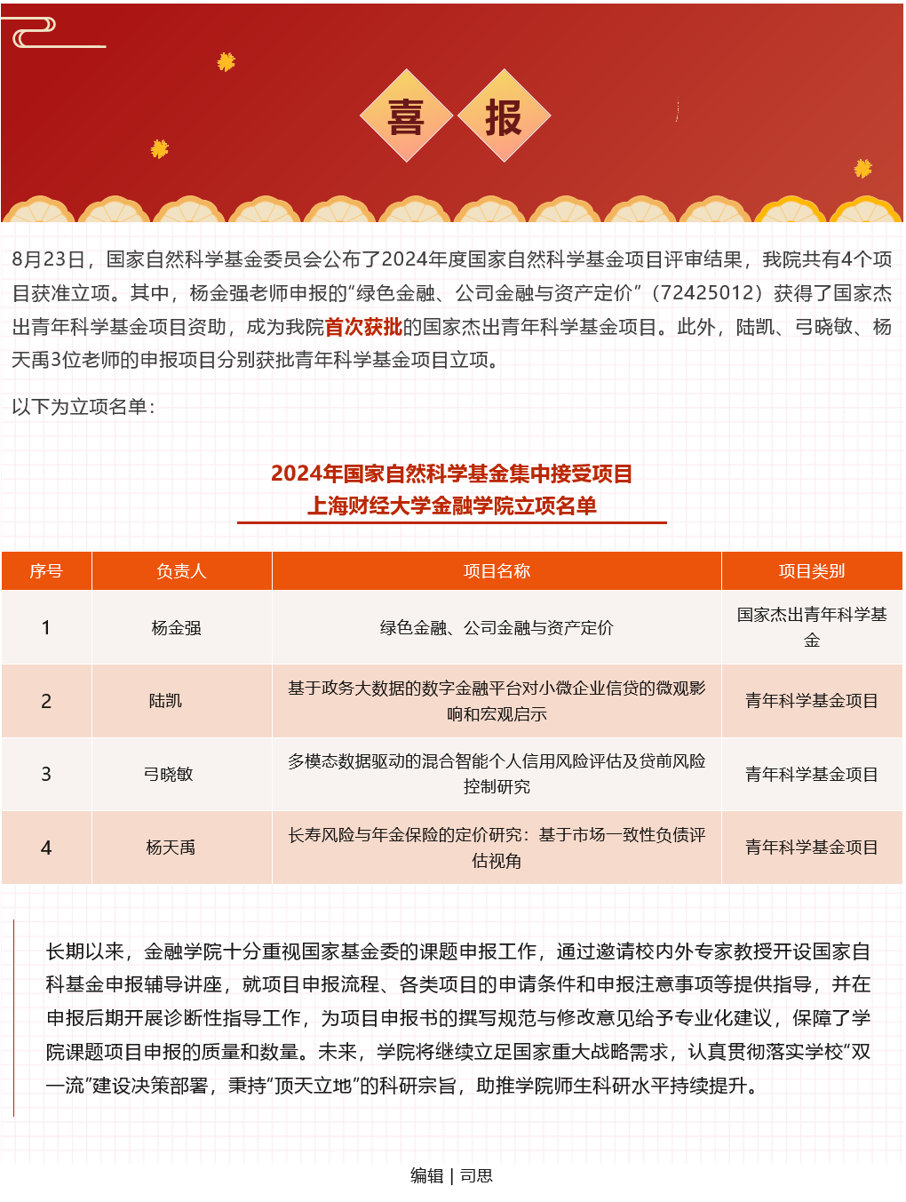 喜报 | 首获国家杰青!金融学院2024年度国家自然科学基金项目立项再创佳绩!