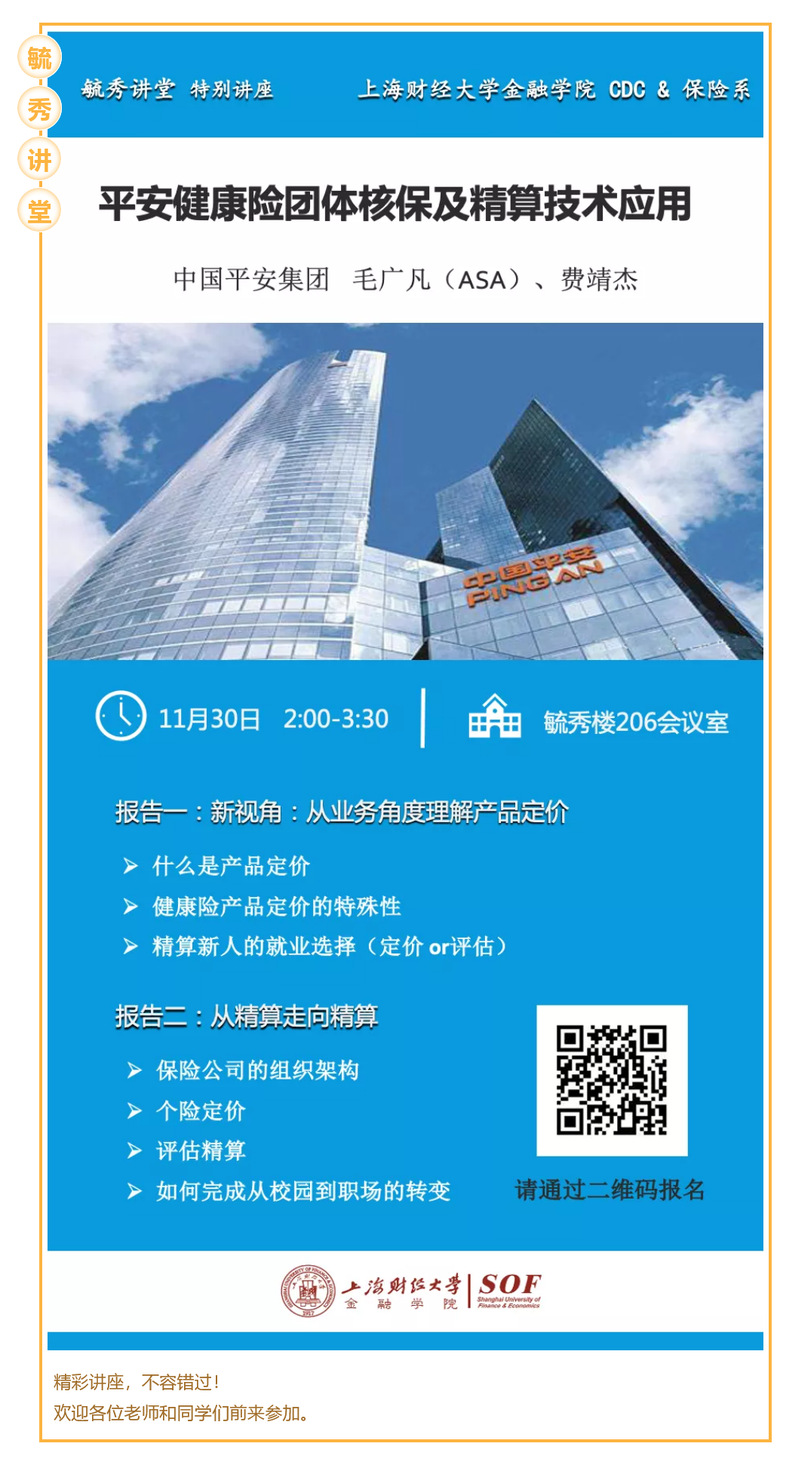毓秀讲堂 |【讲座预告】特别讲座“平安健康险团体核保及精算技术应用”(毛广凡、费靖杰)
