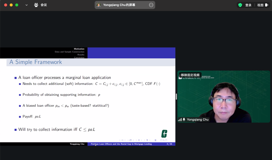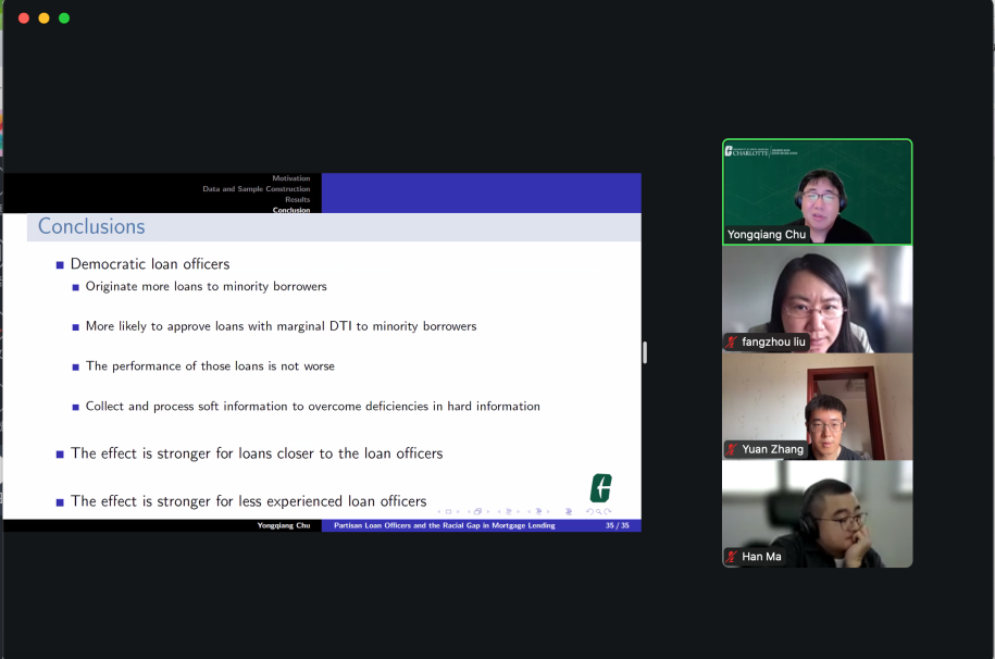 10月8日,北卡罗来纳大学夏洛特贝尔克商学院Childress-Klain房地产中心主任、金融学教授Yongqiang Chu教授为上海财经大学金融学院的师生们带来题为《信贷员党派属性与住房抵押贷款中的种族差距》的报告,金融学院张元老师主持研讨。