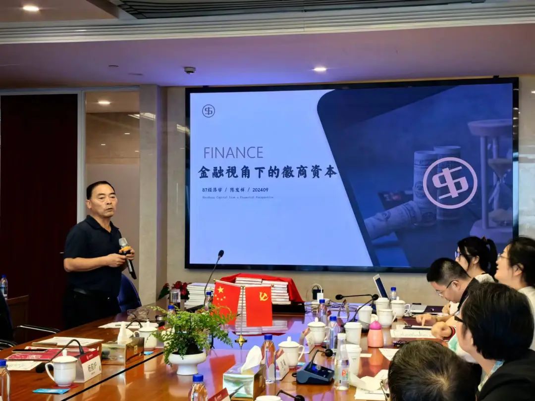 陈发祥校友从徽商视角、徽商产业、融资模式、金融视角四个方面,层层递进地讲述了金融视角下的徽商资本。他表示,金融视角既是历史学的视角,也是经济学的视角,是从商业模式、经营理念的角度来进行关照。通过简单介绍中国十大地方商帮,他以徽商为例,阐述了资本积累的渠道和特点,徽商虽多为小本生意起家,但注重长期性,集腋成裘,通过合作来整合各类社会资源为商业服务。