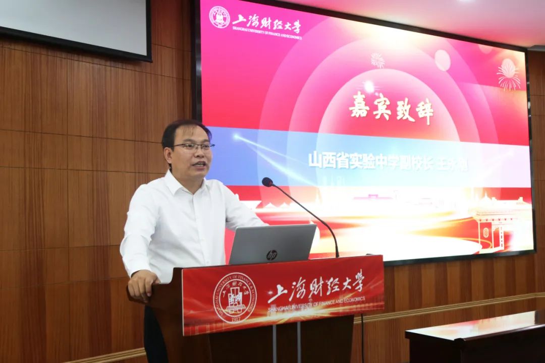 王永刚校长感谢学校和金融学院对山西籍学子们的关怀和支持,也希望通过与上财领导和老师们进行深入交流,更好地进行中学优秀人才的培养。他高度评价了上财在中国财经教育领域的领先地位,深厚的历史底蕴,以及在金融改革与发展中的重要作用,并对顺利考取上财的山西学子们表示祝贺。他表示,上海财经大学等重点院校在教育强国建设中起着关键作用,而中学在为高等教育提供人才支持方面也有许多思考。他分享了山西省实验中学在理想信念教育、拔尖创新人才培养方面的经验做法,并就协同培养人才,联合举办教师游学活动等提出建议,对学子们提出了今后要“立德修身,全面发展,团结互助”的期望。