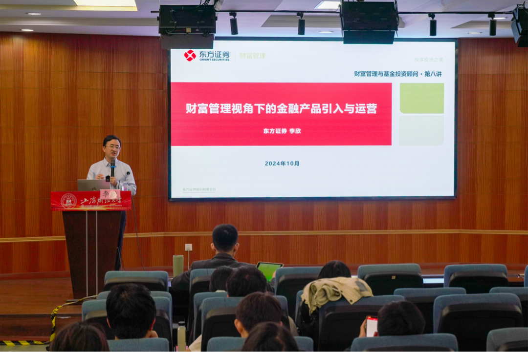 10月22日,上海财经大学与东方证券联合开设的《财富管理与基金投资顾问》第五讲《财富管理视角下的金融产品引入与运营》由东方证券金融产品总部产品引入负责人、金融产品评审委员会委员李欣先生主讲,从公募基金发展背景与历程、财富视角下的金融产品运营、财富管理关键服务:基金投顾、财富管理长期服务:个人养老金四个部分进行了生动而专业的分享。在演讲的尾声,李欣先生推荐了相关读物供有志于从事财富管理行业的学生们阅读,同时耐心地回答了同学们对于财富管理行业与将来就业相关的提问。