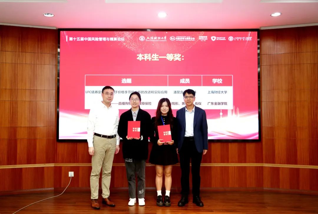 ▲ 于文广教授、蔡军教授、中国精算师协会杨麟先生颁发本科生组二等奖