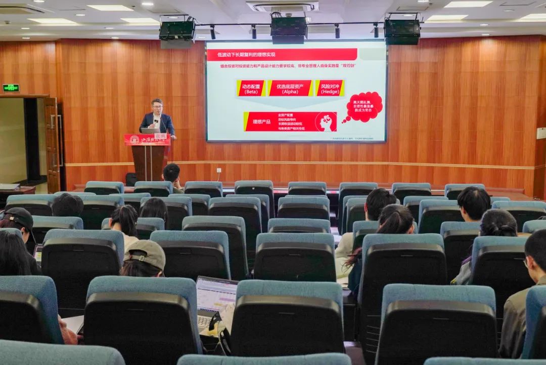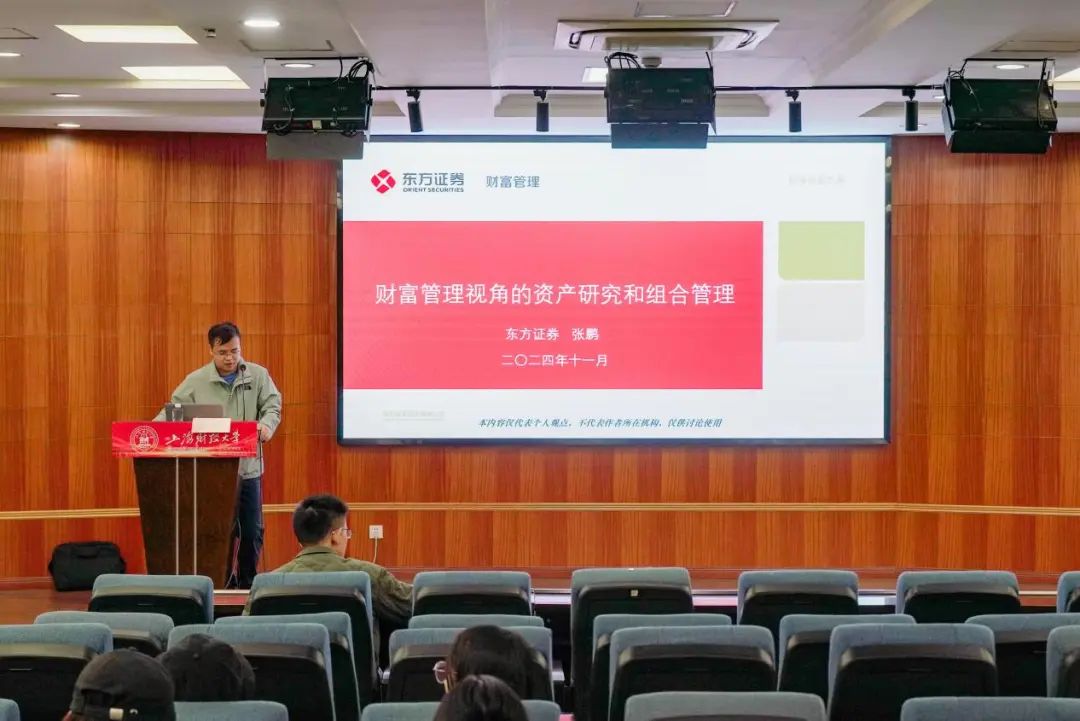 11月5日,上海财经大学与东方证券联合开设的《财富管理与基金投资顾问》第七讲《财富管理视角的资产研究和组合管理》邀请到东方证券财富管理委员会金融产品总部副总经理张鹏先生授课,共100余名硕士研究生参加。他以“财富管理视角的资产研究和组合管理”为主题,从财富管理的定义和行业实践、财富管理视角的资产研究、财富管理视角的组合管理以及财富机构投研岗位要求等四个方面进行了分享,让同学们深入了解了财富管理买方投研体系。