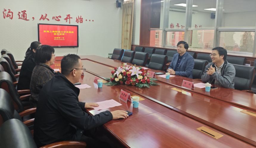 上海财经大学实验中心副主任谢斐教授,金融学院办公室主任彭伟老师、行政张月老师在太原市尖草坪区第一中学进行了座谈及讲座,尖草坪一中党总支书记、校长卢文青及部分校级中层领导陪同参与。在交流座谈会上,谢斐老师介绍了上海财经大学目前的专业设置及发展趋势,并对优质生源基地合作项目做了最新的规划和展望,欢迎尖草坪一中优秀学子通过暑期研学或夏令营进入上财大校园参观。