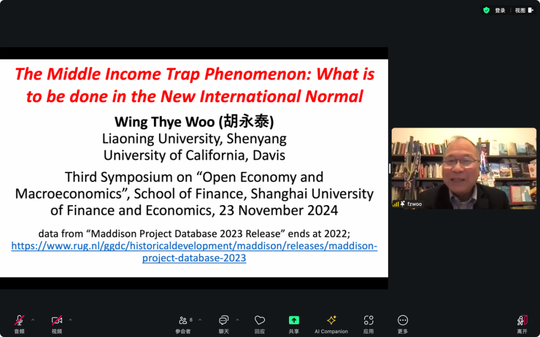 胡永泰教授的主旨演讲题目为“The Middle-Income Trap Phenomenon: What is to be done in the New International Normal”,深入分析了中等收入陷阱现象及其在全球新秩序下的应对策略。首先,他提出了一个基于人均GDP与美国人均GDP比率的追赶指数,以衡量一个国家的发展水平。并探讨了影响国家经济增长的三大障碍:硬件问题(如经济机制失败)、软件问题(如社会政治治理失败)和外部因素(如气候变化、国际冲突)。他的研究证明了国际合作的重要性,特别在新的国际环境中,要建立信任和合作机制,克服“中等收入陷阱”,以实现可持续的经济发展。