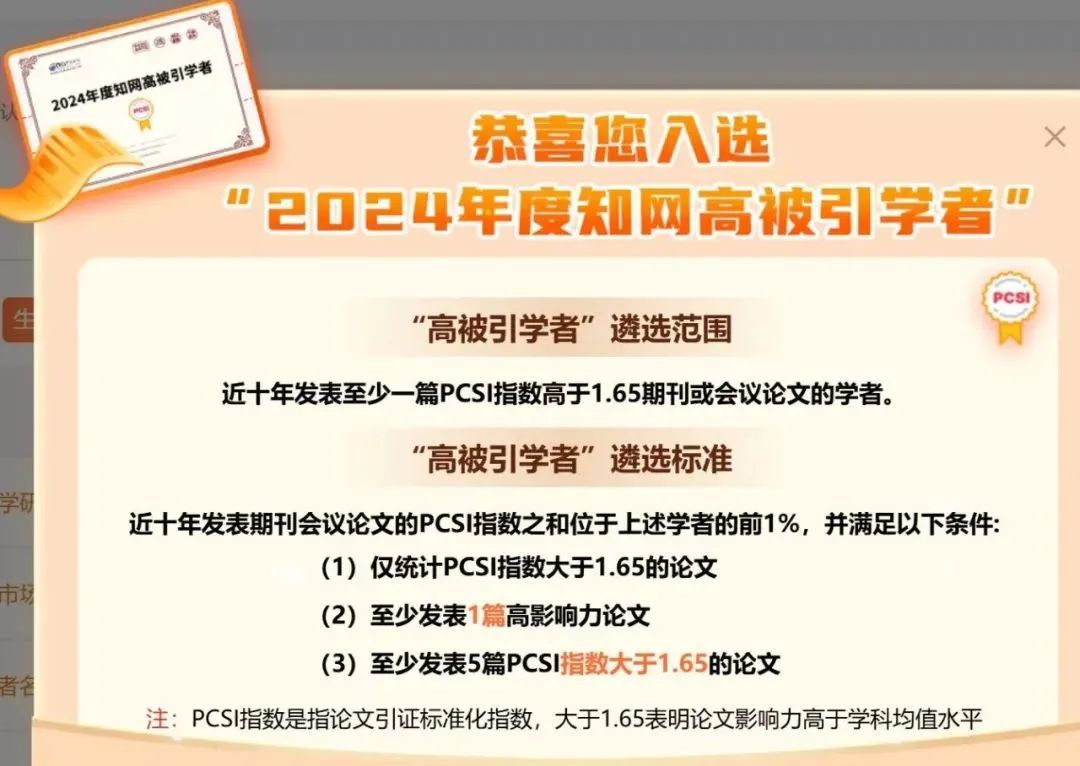 2024中国知网高被引学者TOP1%需满足:近十年发文的作者总PCSI位于初选作者范围的TOP1%(共有学者3万人,基线值为31.016);且近十年发表PCSI高于理论平均值(1.65)的论文不少于5篇以及近十年至少发表1篇学术精要高影响力论文。
