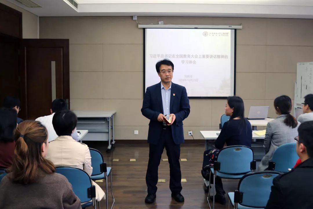 2018年10月23日在毓秀楼206,金融学院党委书记刘莉亚为全院教工党员和学生党支部委员上专题党课《习近平总书记在全国教育大会上重要讲话精神的学习体会》。全院教工党员、学生党支部委员共80人到会。党课由金融学院常务副院长、副书记柳永明主持。本次党课是金融学院学习贯彻全国教育大会精神系列活动之一。