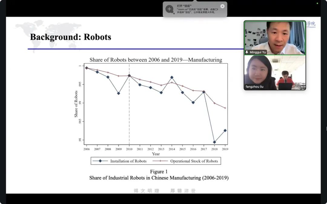 2025年4月29日上午,中南财经政法大学金融学院院长余明桂教授为金融学院师生带来了一场主题为“From Property to Productivity: Analyzing Real Estate Purchase Restrictions and Robotics Adoption in China(从房地产到生产力:中国房地产购买限制和机器人应用分析)”的报告分享。报告围绕房地产限购政策与企业机器人应用之间的关联问题展开,主要研究中国房地产限购政策如何通过劳动力成本这一关键因素,对企业在技术应用层面的决策产生影响。
