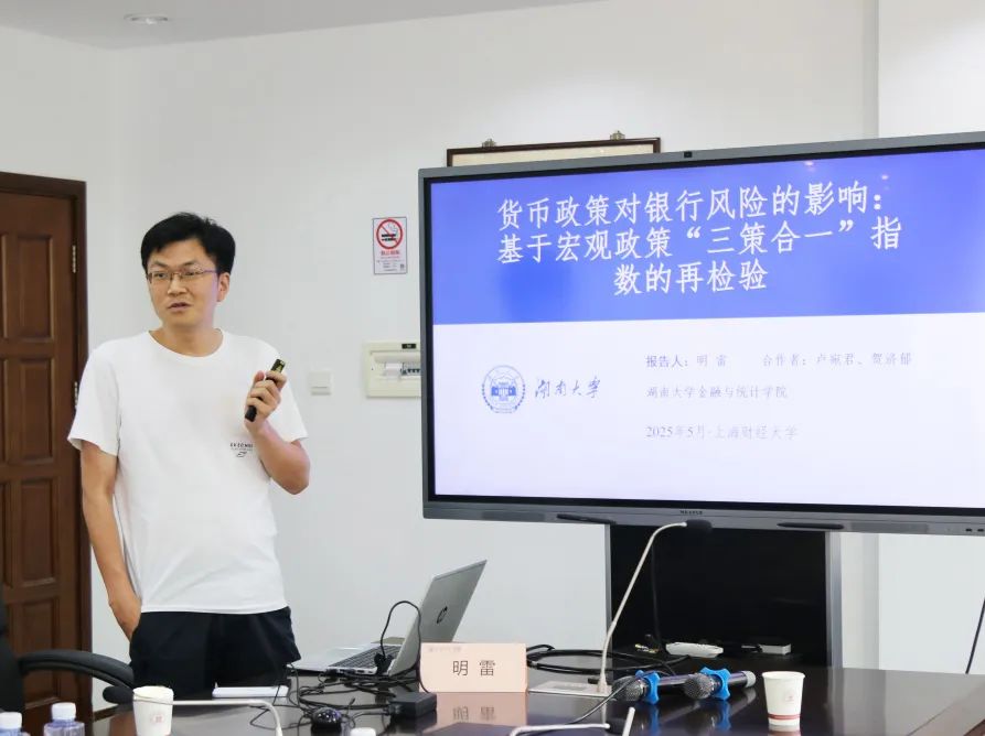 湖南大学明雷副教授的报告为《货币政策对银行风险的影响:基于宏观政策“三策合一”指数的再检验》,借助宏观政策“三策合一”指数,重新检验了货币政策对银行风险的影响,研究发现,传统单一指标(如M2、存款利率)无法准确刻画政策效果,而综合“货币政策力度指数”显示:宽松政策通过“资产收益率下降→追逐风险”和“抵押品估值上升→低估违约风险”渠道推高银行风险资产比例。