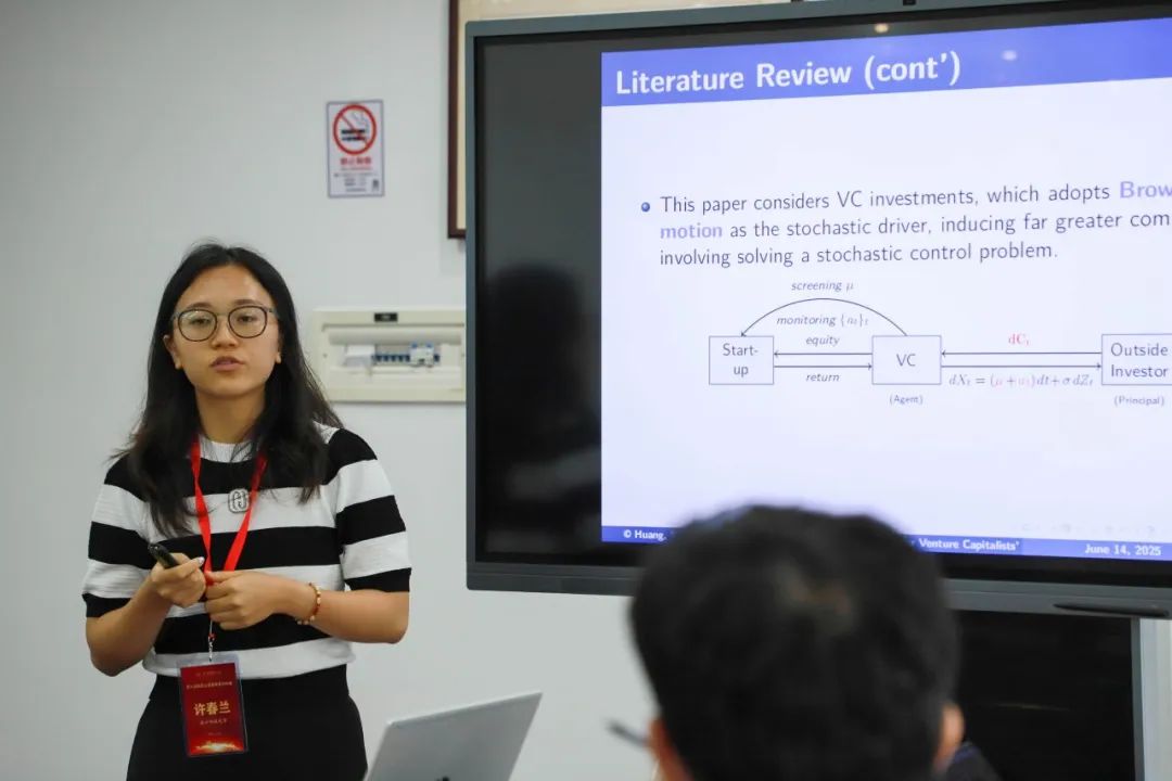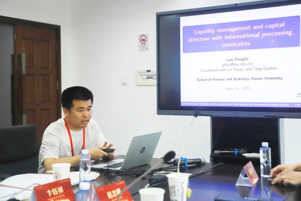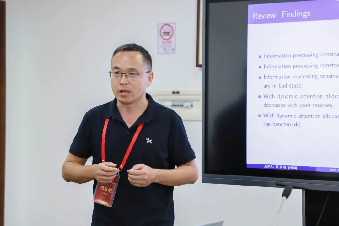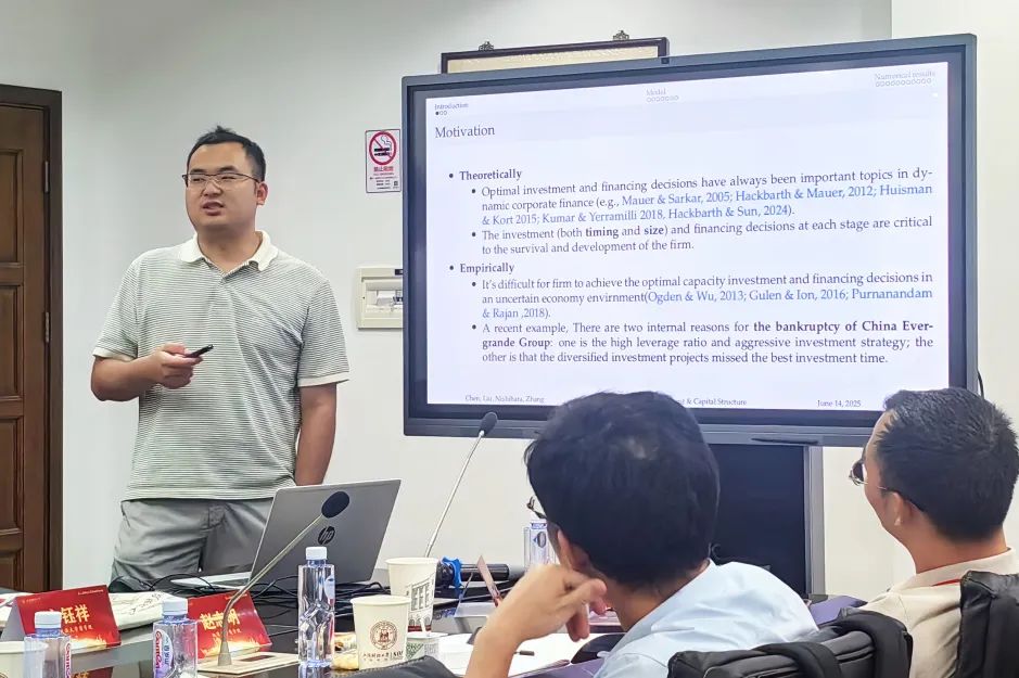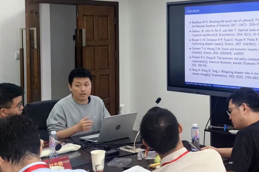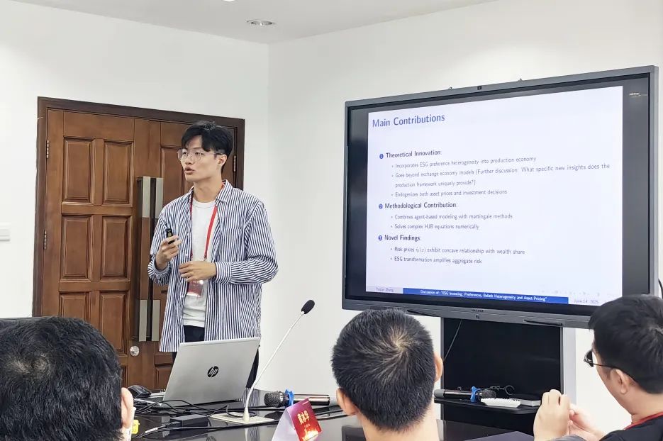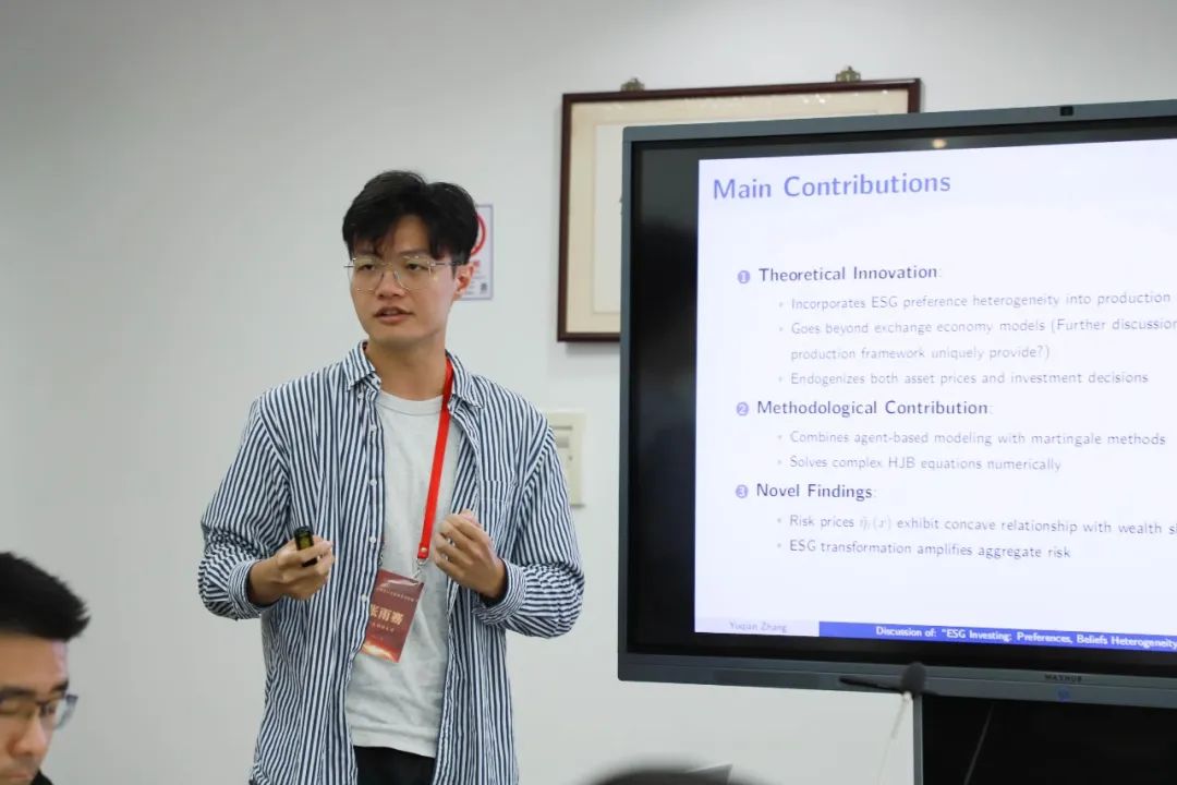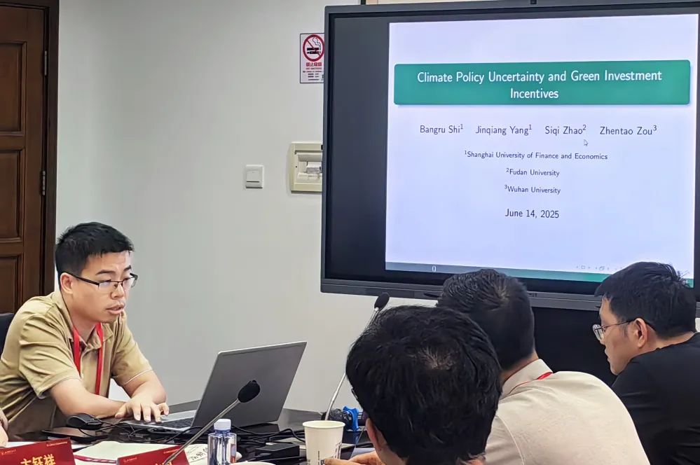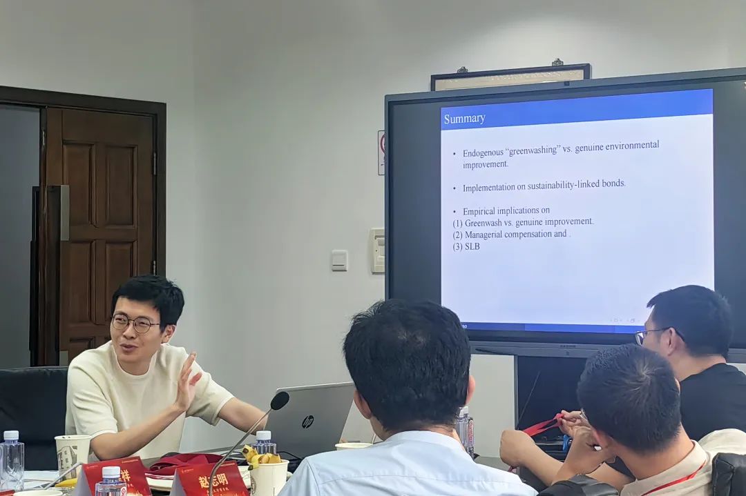 湖南大学金融与统计学院罗鹏飞副教授汇报了题为《Liquidity management and capital structure with informational processing constraints》的论文,湖南大学金融与统计学院母从明副教授进行了点评;华东政法大学商学院李世林讲师汇报了题为《ESG investing: preferences, beliefs heterogeneity, and asset pricing》的论文,广东财经大学张雨骞讲师进行了点评;江西财经大学金融学院谭英贤教授汇报了题为《Environment adaptation investment and policy responses in the age of climate change》的论文,武汉大学经济与管理学院邹镇涛副教授进行了点评;浙江工商大学王诗博讲师汇报了题为《Financially Constrained Adaptation Union of Disaster Risks》的论文,华东政法大学商学院卞钰祥副教授进行了点评;南方科技大学许春兰博士生汇报了题为《Dynamic incentives for venture capitalists’ screening》的论文,新华都商学院甘柳副教授进行了点评;西南财经大学金融学院陈彪副教授汇报了题为《Dynamic capacity investment and capital structure》的论文,湘潭大学商学院赵志明副教授进行了点评;武汉大学经济与管理学院邹镇涛副教授汇报了题为《Climate policy uncertainty and green investment incentives》的论文,中南财经政法大学金融学院夏鑫副教授进行了点评;广东财经大学张雨骞讲师汇报了题为《Information Disclosure, ESG Performance, and Risk-Taking: Dynamic Contract and Security Implementation》的论文,复旦大学经济学院赵思琦讲师进行了点评。