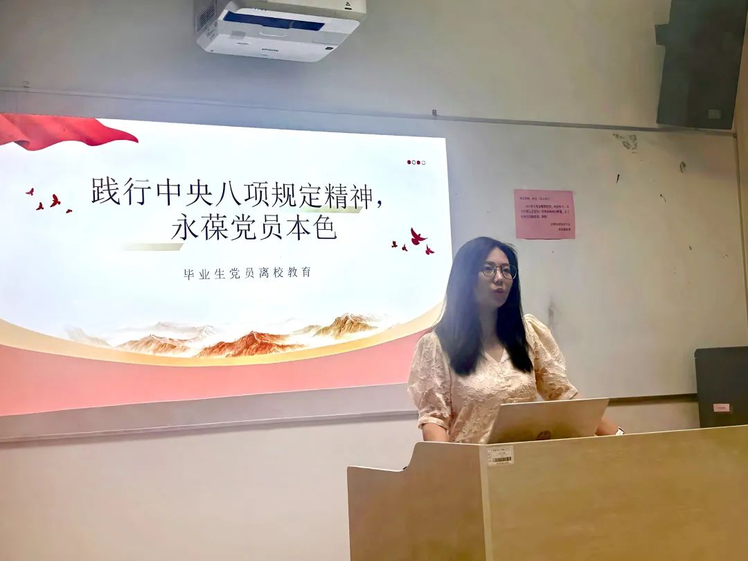 为加强毕业生党员思想政治教育,提升党性修养和身份意识,充分发挥先锋模范作用,党支部书记朱颖以《践行中央八项规定精神 永葆党员本色》为主题,引导毕业生党员时刻牢记党员身份、恪守纪律底线、发挥专业所长、积极服务社会。随后,党支部组织委员徐思语就毕业生党员组织关系转移流程进行了详细的介绍,党支部书记朱颖进一步强调组织关系转接的重要性和恢复组织生活的要点。