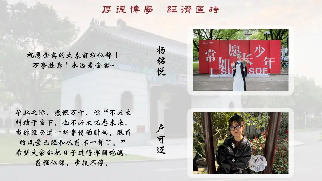 “感恩遇到金实的大家,祝我们毕业快乐。他日若买桂花同载酒,愿还似,少年游。”