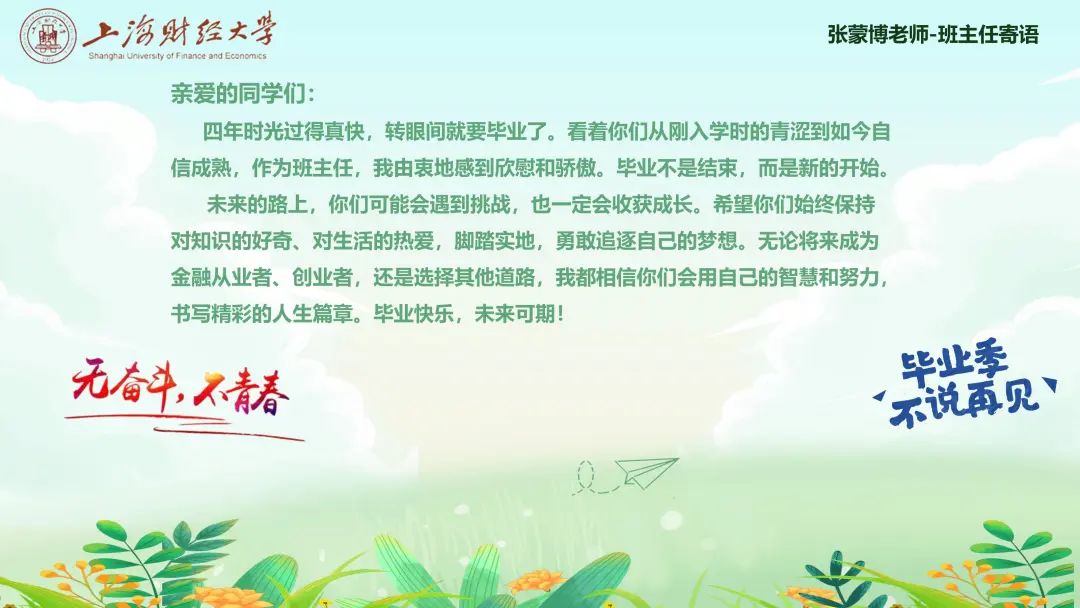 未来的路上,你们可能会遇到挑战,也一定会收获成长。希望你们始终保持对知识的好奇、对生活的热爱,脚踏实地,勇敢追逐自己的梦想。无论将来成为金融从业者、创业者,还是选择其他道路,我都相信你们会用自己的智慧和努力,书写精彩的人生篇章。毕业快乐,未来可期!