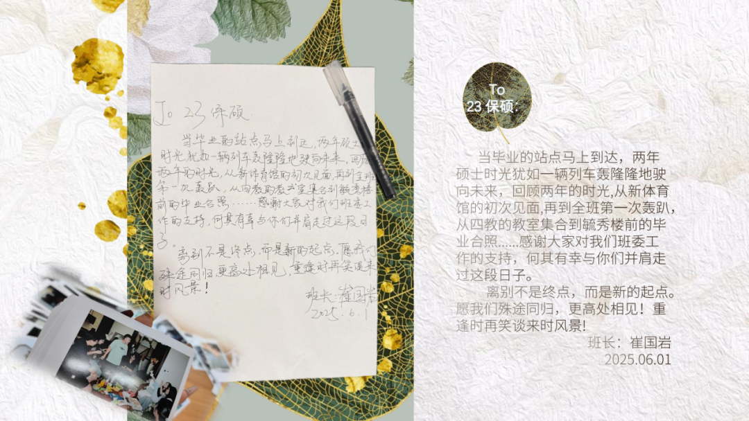 当毕业的站点马上到达,两年硕士时光犹如一辆列车轰隆隆地驶向未来。回顾两年的时光,从新体育馆的初次见面,再到全班第一次轰趴,从四教的教室集合到毓秀楼前的毕业合照......感谢大家对我们班委工作的支持,何其有幸与你们并肩走过这段日子。