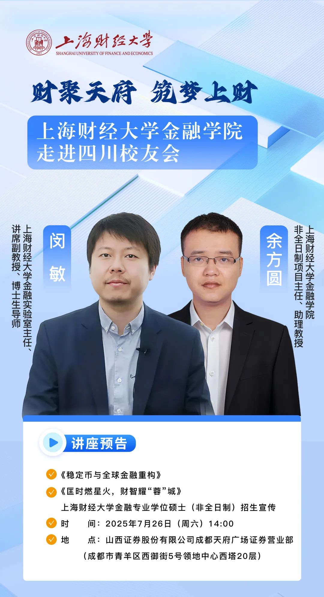 主 题:《稳定币与全球金融重构》 嘉 宾:闵 敏(上海财经大学金融实验室主任,金融工程与量化投资方向项目主任,讲席副教授、博士生导师) 主 题:全体校友、嘉宾交流互动 | |