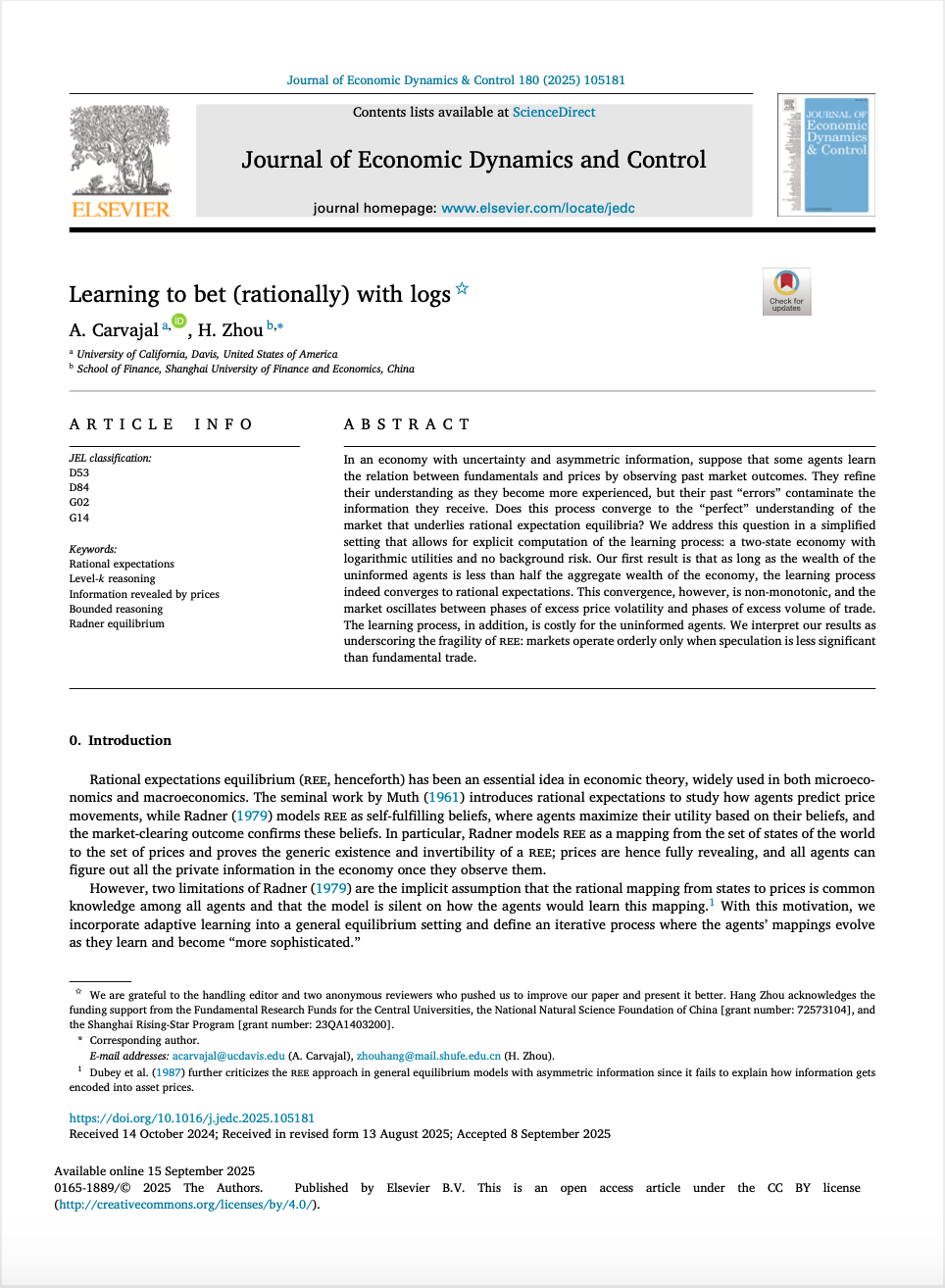 近期,我院周航老师与合作者的论文“Learning to bet (rationally) with logs”发表在国际权威期刊Journal of Economic Dynamics and Control上。在线资源请点击“阅读原文”获取链接。