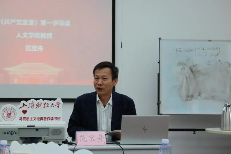 接着,人文学院教授范宝舟老师以“历史背景—理论脉络—当代价值”为框架作首场导读。他系统梳理了《共产党宣言》的生成逻辑与核心要义,结合当代理论新发展揭示马克思主义持久生命力,并落脚于文本的当代意义,阐明其在方法论创新与价值引领层面的深远启示。