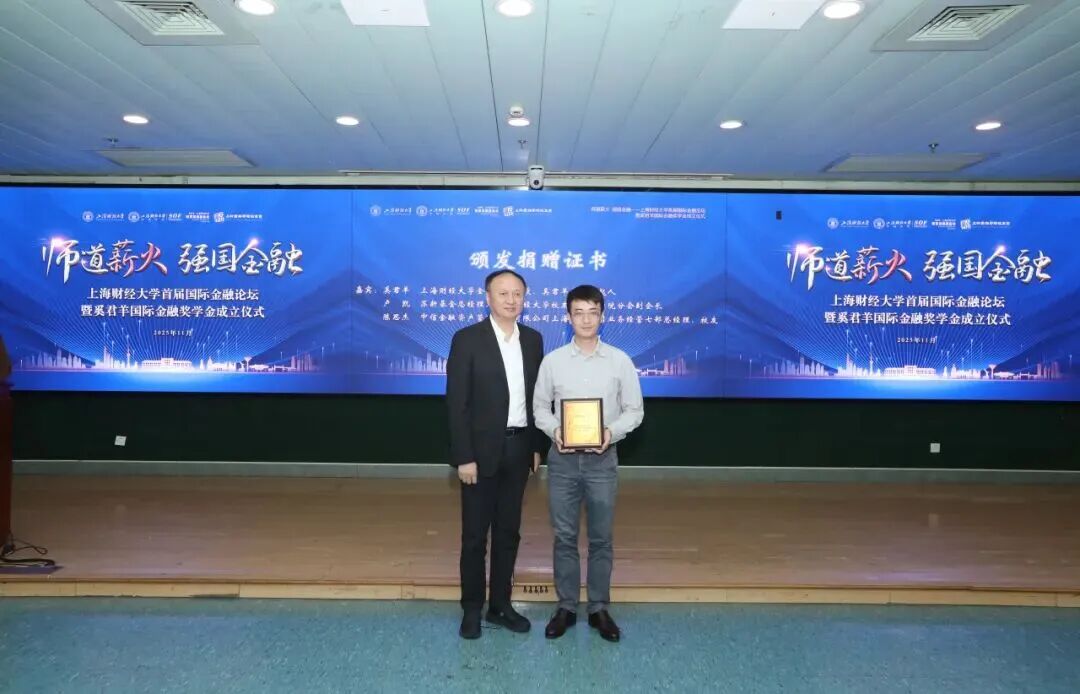 许涛书记为“奚君羊国际金融奖学金”发起人校金融学院奚君羊教授,以及捐赠代表苏新基金总经理卢凯、中信金融资产上海分公司陈思杰颁发了捐赠证书。