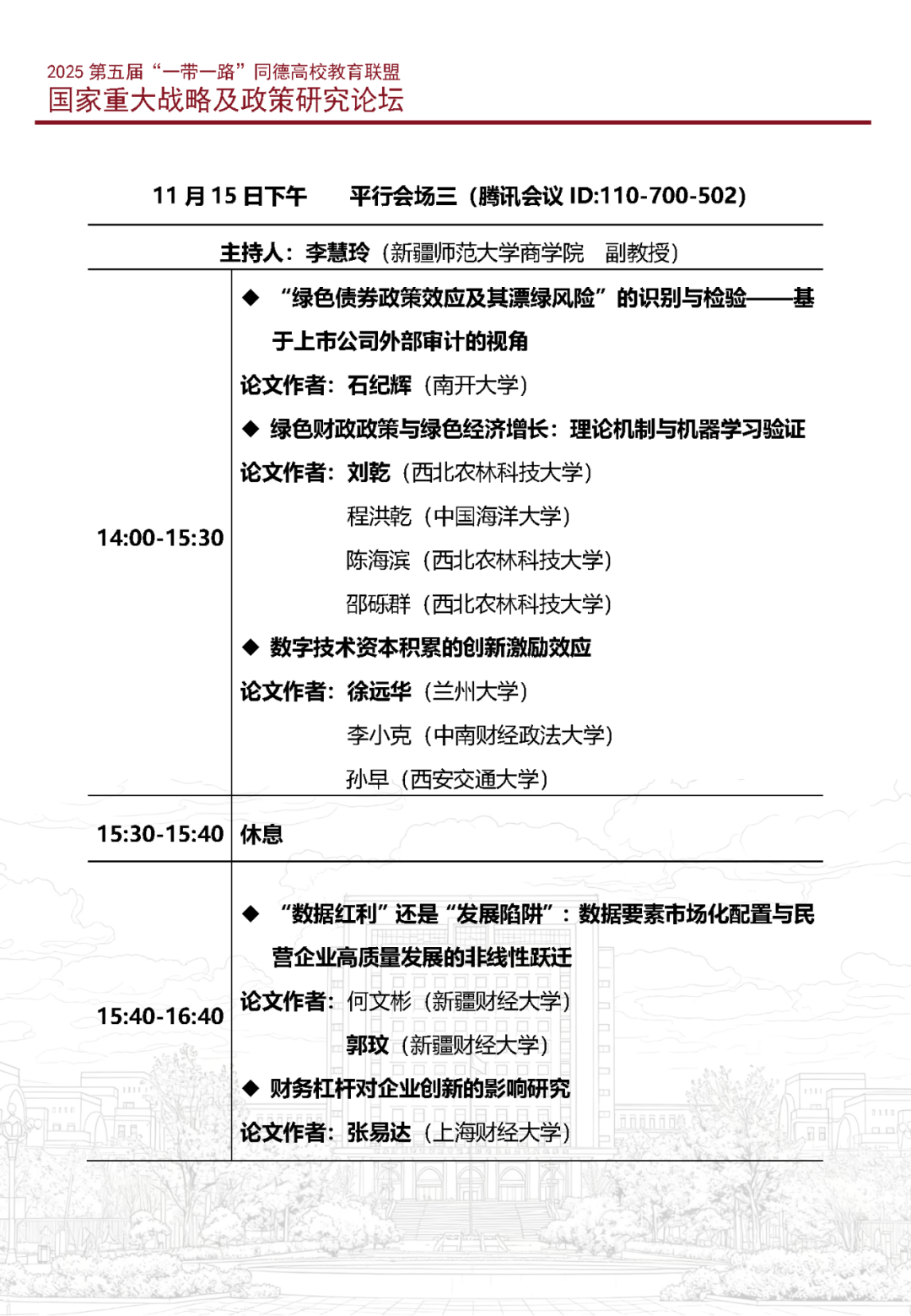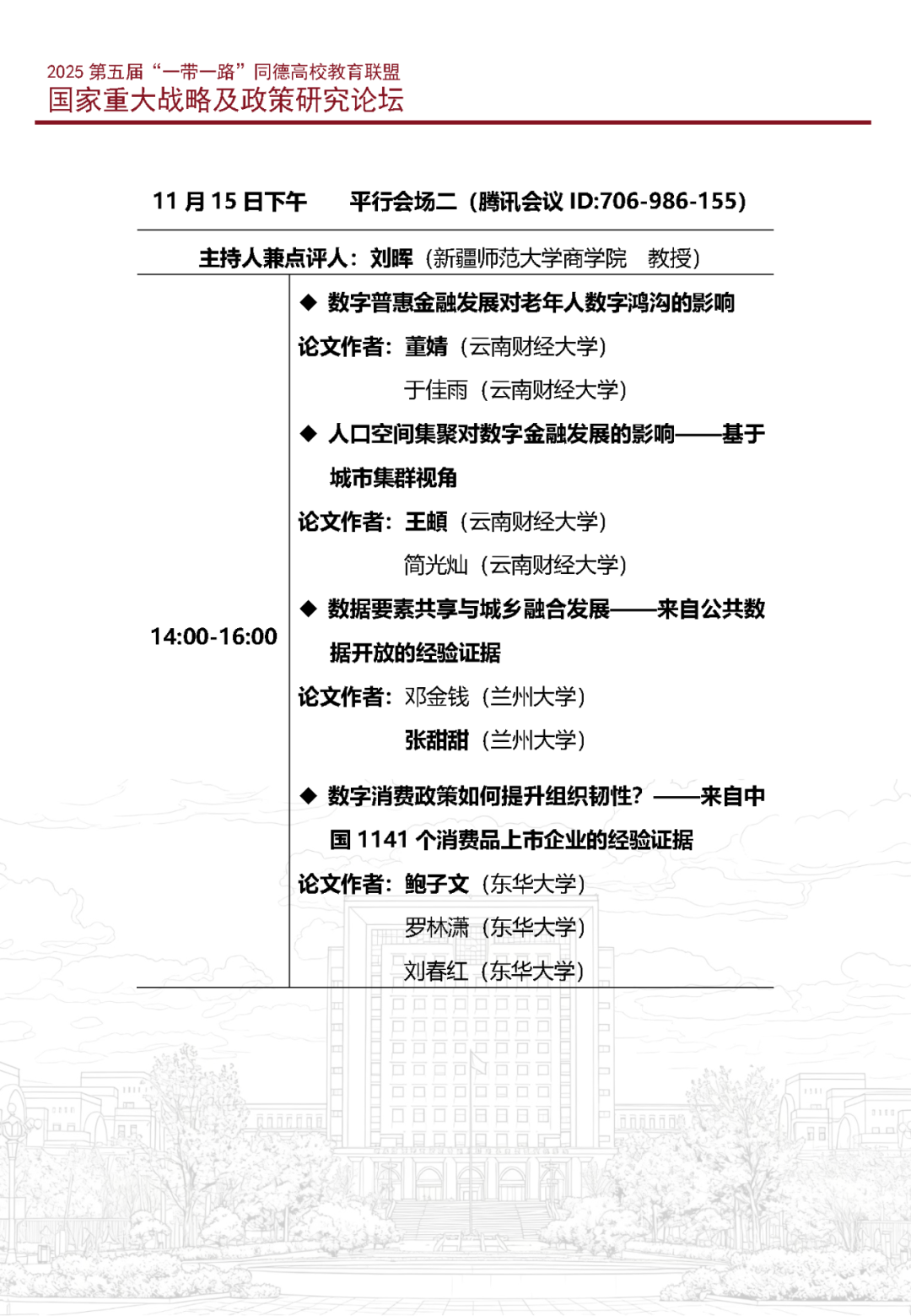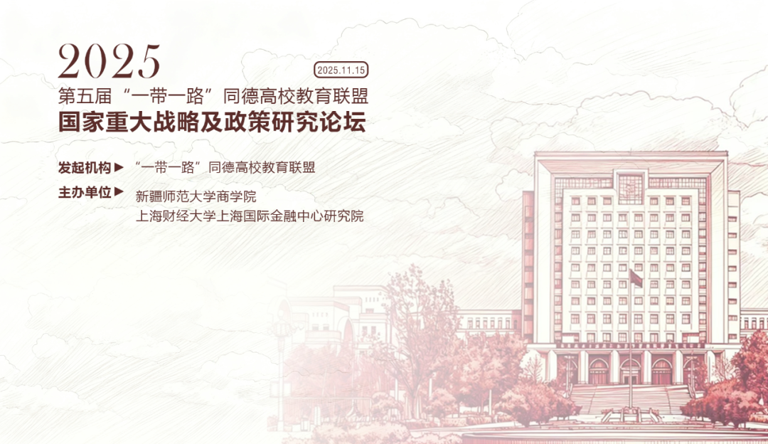 2025第五届“一带一路”同德高校教育联盟国家重大战略及政策研究论坛计划于2025年11月15日(线上)举行,由新疆师范大学商学院与上海财经大学上海国际金融中心研究院联合举办,会议将邀请各界专家、期刊编辑做专题讲座,获奖论文作者也将在会上进行论文宣讲,并由嘉宾对论文进行点评讨论。