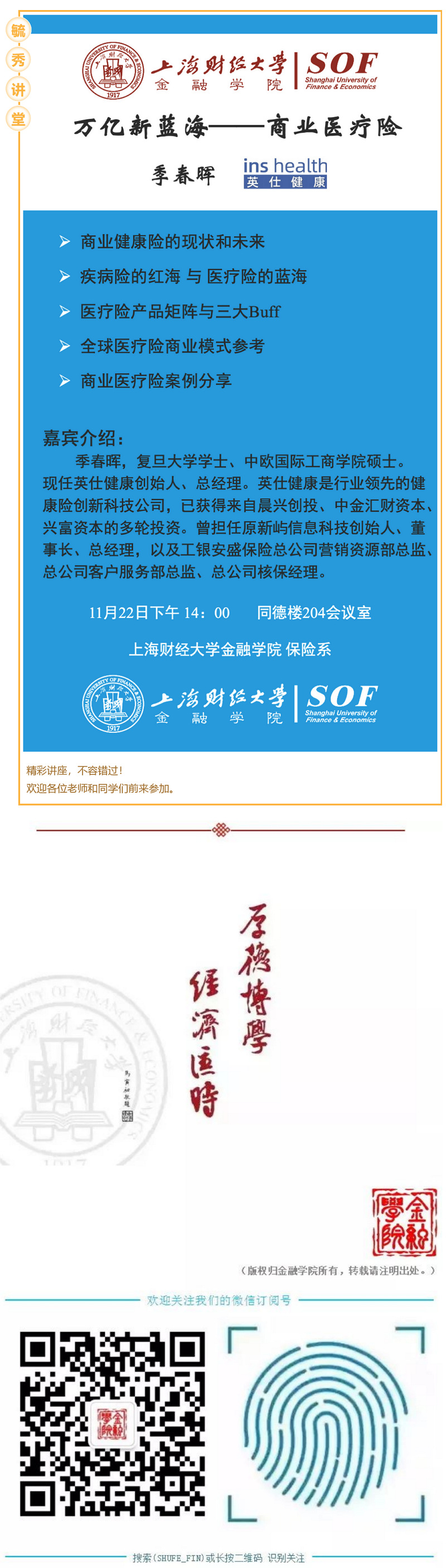 毓秀讲堂 |【讲座预告】第61讲 “万亿新蓝海——商业医疗险”(季春晖)