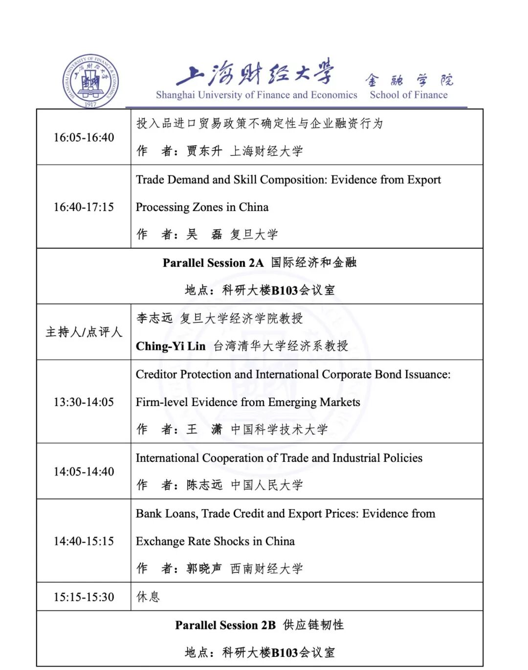 Parallel Session 2A 国际经济和金融 | 科研大楼 B103 会议 |
