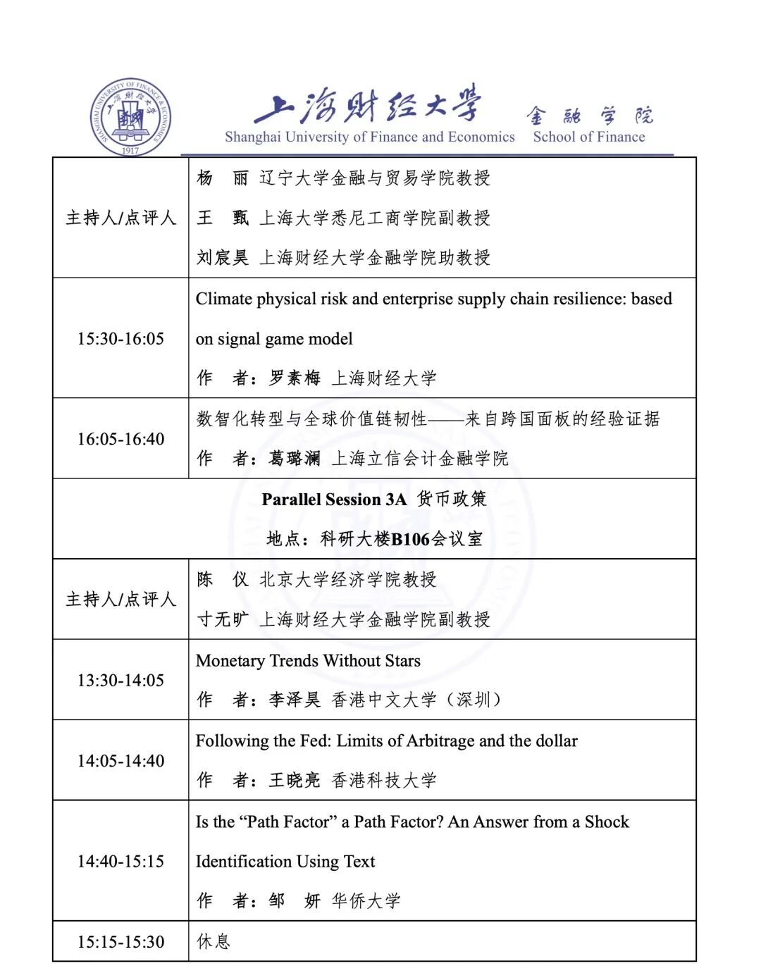Parallel Session 3A 货币政策 | 科研大楼 B106 会议室 |