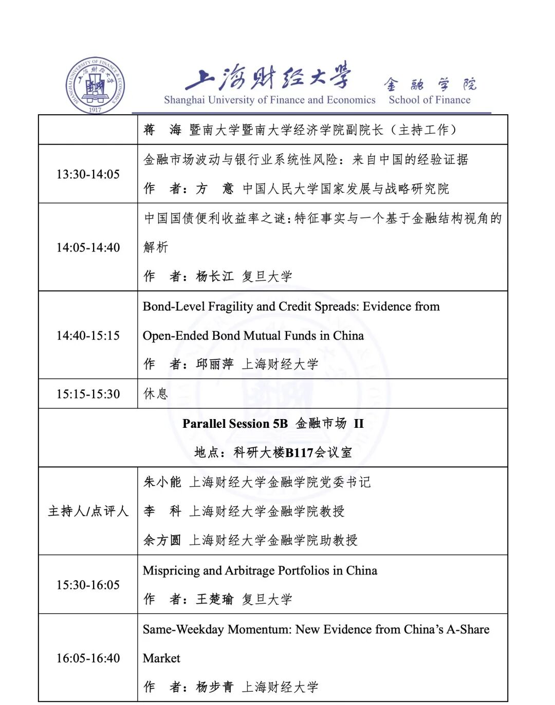 Parallel Session 5A 金融市场 I | 科研大楼 B117 会议室 |