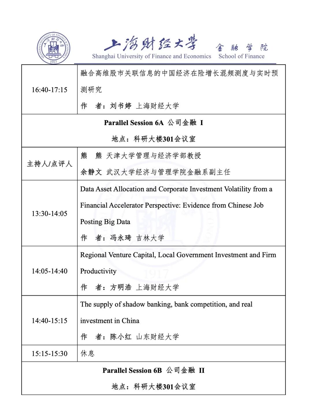 Parallel Session 6A 公司金融 I | 科研大楼 301 会议室 |