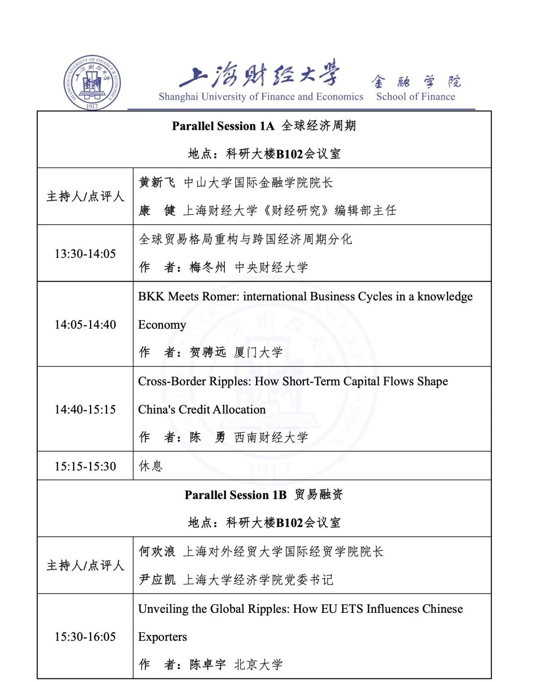 Parallel Session 1A 全球经济周期 | 科研大楼 B102 会议室 |