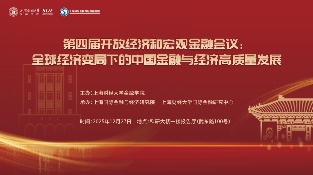 由上海财经大学金融学院主办,上海国际金融与经济研究院、上海财经大学国际金融研究中心承办的第四届“开放经济与宏观金融 ”研讨会将于2025年 12月27日在上海财经大学举办。本次研讨会将聚焦“全球经济变局下的中国金融与经济高质量发展”,邀请国内外开放经济与宏观金融领域的专家学者,通过学术思想的交流与碰撞,引领开放经济与宏观金融交叉学科在中国和世界的发展,培育适应更高水平开放型经济新体制要求的领军人才,为推动建设更高水平的开放型经济新体制做出贡献。