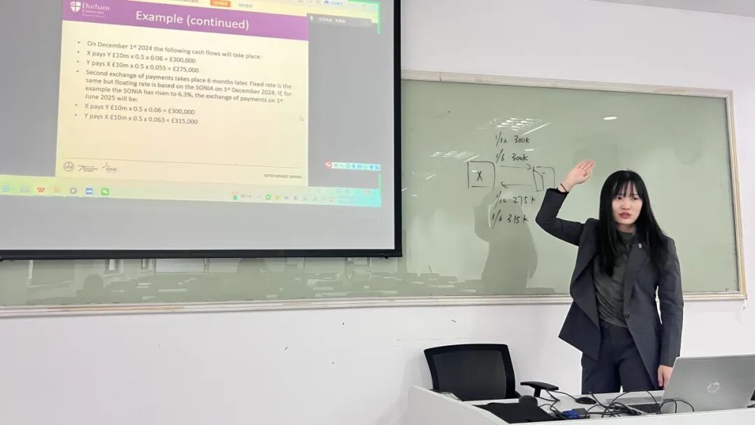 在随后的“利率互换大师讲堂”环节中,杜伦大学商学院金融系助理教授、金融系国际化事务主管 Gao(Grace)教授 以 Interest Rate Swap(利率互换) 为主题,为同学们带来了一场紧贴行业实践的专业讲座。