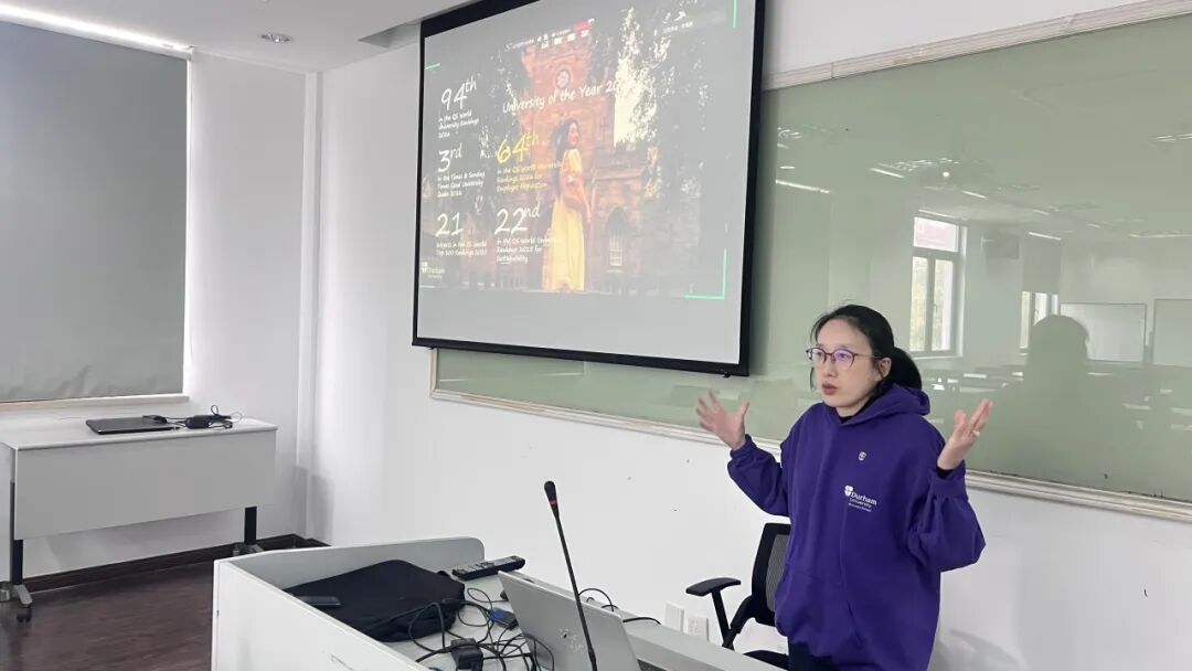 在 GMF 项目信息宣讲环节中,杜伦大学商学院金融学副教授、教育副主管及国际合作项目主管 Huang 教授 以中英双语介绍了杜伦大学和商学院的整体情况。她强调,杜伦大学创建于1832年,是英国历史最悠久的公立研究型大学之一、罗素大学集团成员,与牛津、剑桥同属英国传统名校。学校实行独具特色的学院制,学生在隶属于商学院、金融学院等院系的同时,还将归属具体学院,获得住宿、学业辅导、朋辈导师、社团活动与职业发展在内的“一站式”支持,是学生在杜伦学习生活的“第二个家”。